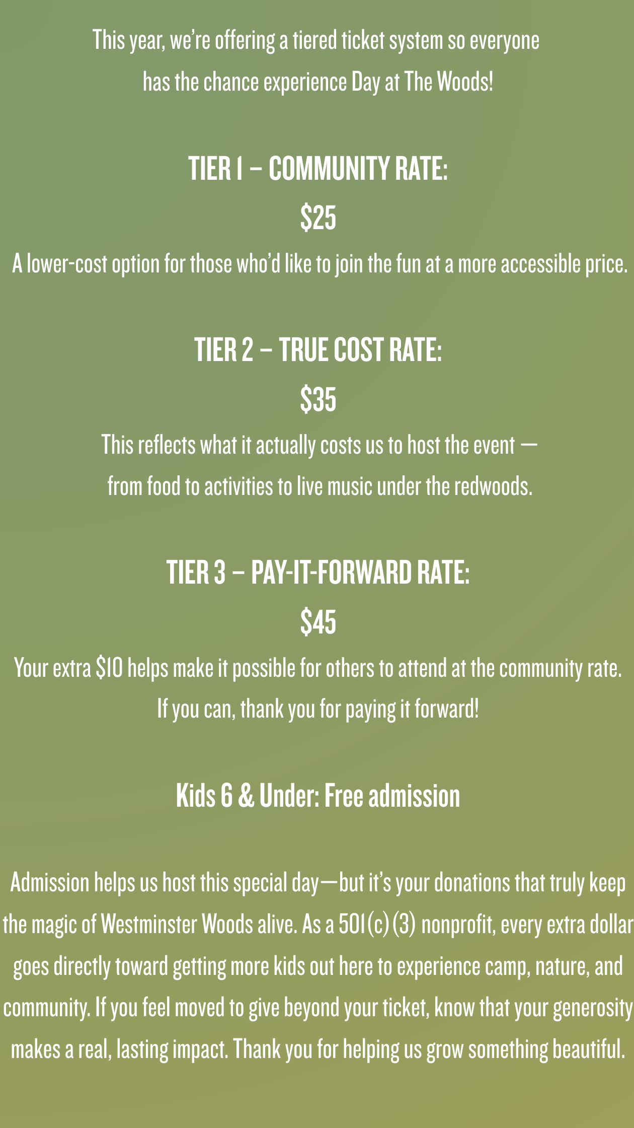 We cannot wait to welcome you to our 2nd Annual Day at The Woods, and we can’t thank you enough for supporting us on such a meaningful milestone.