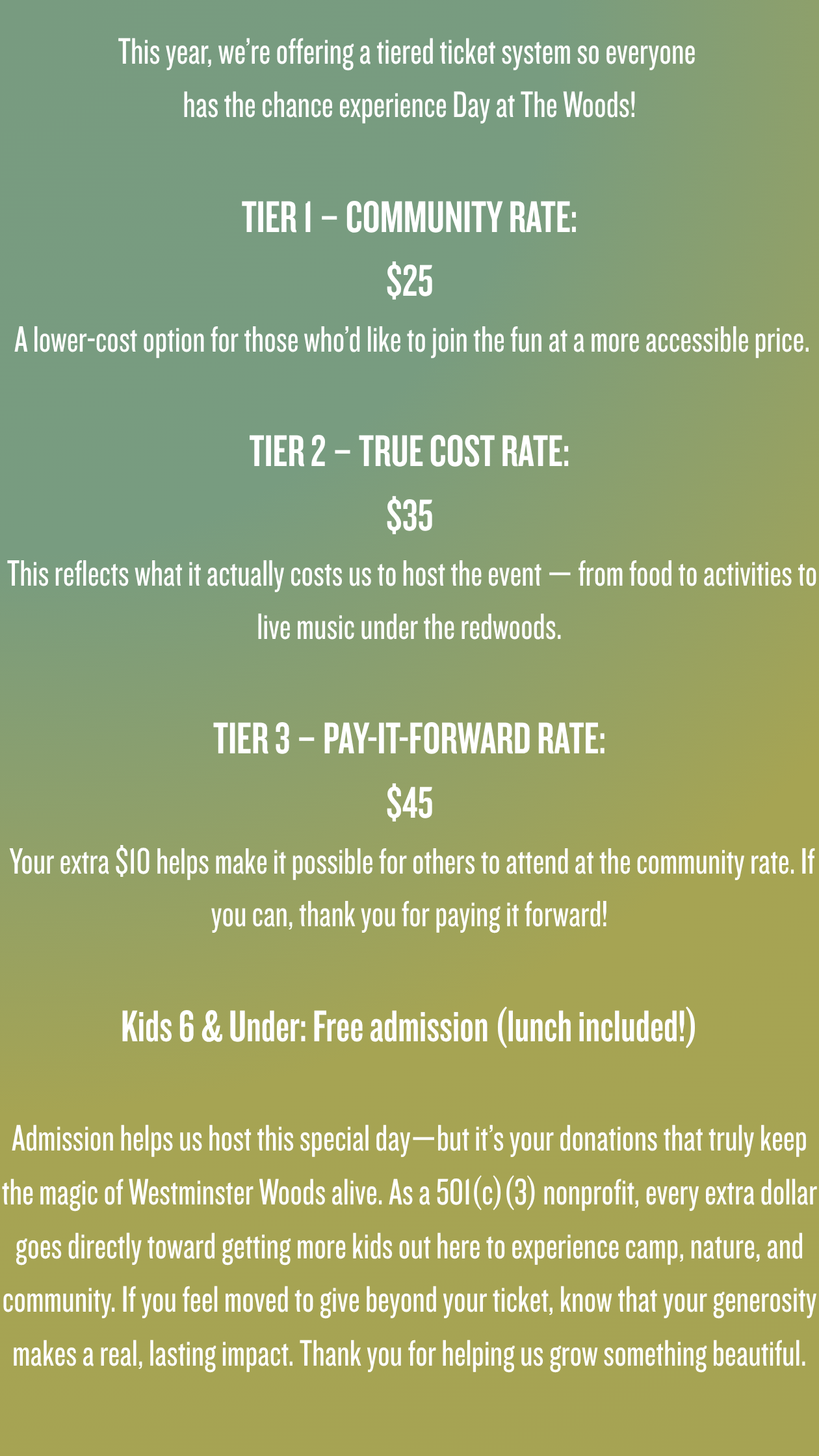 Proceeds from this day help support Westminster Woods' mission of providing transformative outdoor experiences for youth — helping the next generation grow in confidence, curiosity, and care for the world around them.