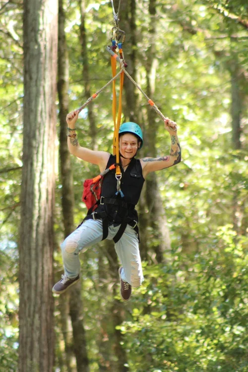 Creek Zip: The Creek Zip is the perfect introduction to the high ropes course. Younger participants and those with little experience with heights can enjoy a relaxing zipline across Dutch Bill Creek. There is opportunity to up the challenge on this activity by wearing a blindfold , going off backwards, or attempting to throw a bean bag through a hoop in mid air!